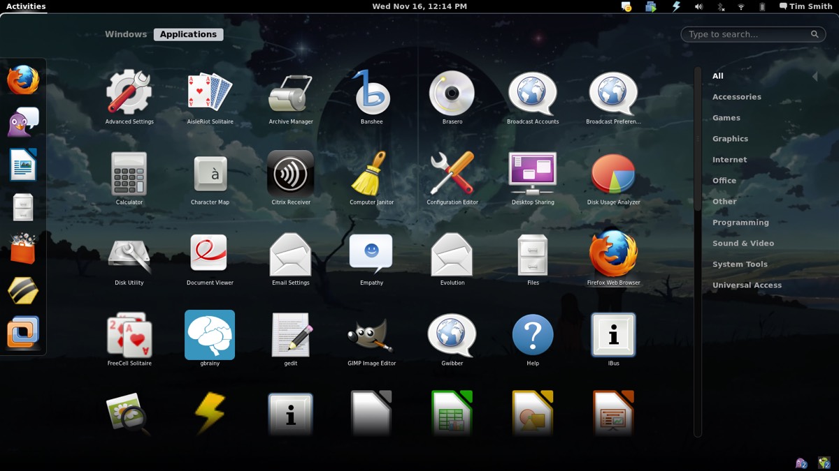 I really enjoy Gnome-Shell - it’s very easy to navigate, and it’s clean and simple. The icons on the left are launchers, and open tasks. If ‘Windows’ is selected instead of ‘Applications’ it will display all windows, whether minimized or not.