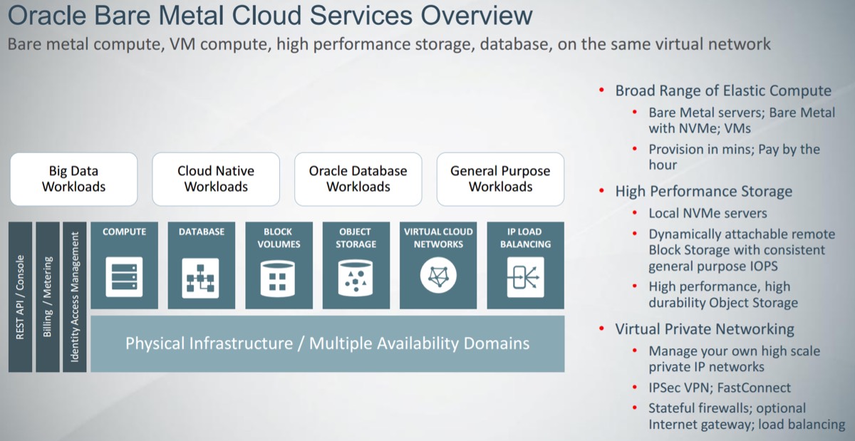 Seattle, Washington, was the first region, with 3 availability domains for redundancy. Like other cloud offerings, the availability domains are connected via extremely low latency connections. But, something new that Oracle brought to the table was the network design. Everything is running in private network overlays. Meaning, (very simplified) they can give customers clean L2 access, that is actually running virtually on top of the physical network.