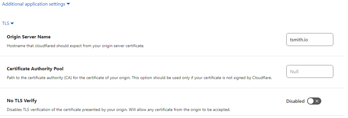 Once the tunnel is saved, there was still some configuration needed, so I chose to edit my mastodon tunnel, and go back to Public Hostname. I added an additional hostname of tsmith.io and setup this service for HTTPS and the URL of localhost:443. Next un der Additional application settings, and TLS, I set the Origin Server Name to my domain name, tsmith.io and clicked Save Hostname.