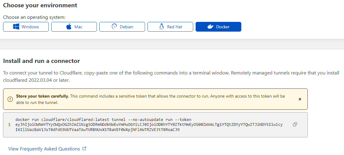The connector is the piece that will live inside my homelab network that makes the connection out to cloudflare, allowing cloudflare to “tunnel” the client into the lab through their network. In my case, using Docker on my Synology was the easiest way for a tunnel connector to live and stay online. Select Docker from the list to see the command that will run inside the container. Yes, I’ve already revoked this token :)