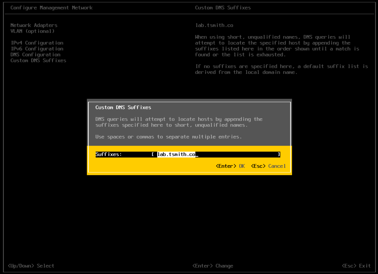 With either fix, VBR should have a DNS entry in the domain, even though it is in a workgroup. One option is to simply populate the Custom DNS Suffix in the ESXi network settings with the domain name. This will tell the hosts that when they are resolving a shortname like “vbr”, to automatically append a domains name onto the end of it - turning it into “vbr.domain.local”. So even thought the filter driver’s config says to contact “vbr” it still resolves to vbr.domain.local, something that the hosts can now resolve to an IP address.