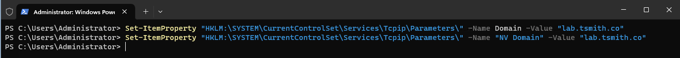 Set-ItemProperty "HKLM:\SYSTEM\CurrentControlSet\Services\Tcpip\Parameters\" -Name "NV Domain" -Value "mydomain.local"